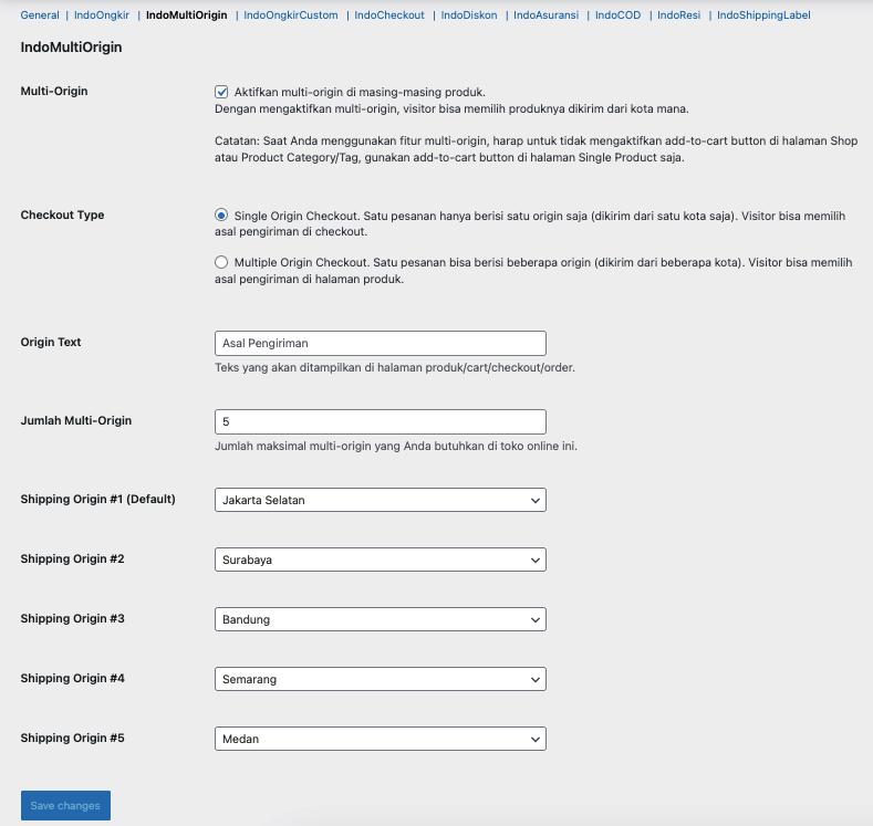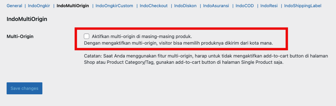 Kita bisa mengakses menu ini di Woocommerce — Setting – IndoOngkir — IndoMultiOrigin – dan Aktifkan
