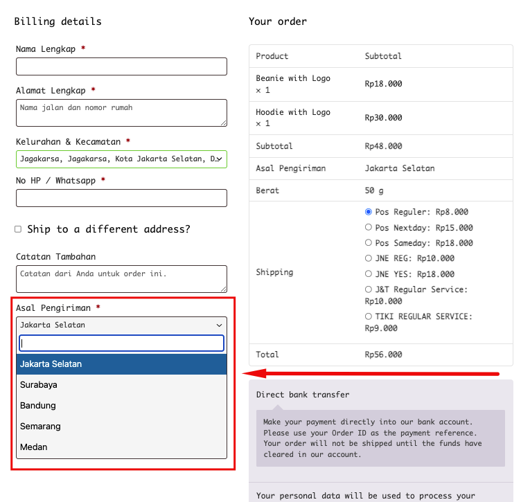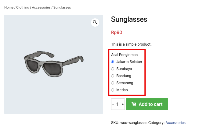 Pada halaman Single Product bisa kita lihat ada pilihan kota asal pengiriman disana. hal ini akan memudahkan pembeli tau produk yang mereka beli tersedia di kota pengiriman mana aja. Multi Origin Checkout ini cocok untuk teman-teman yang stok di setiap kota dinamis. Jadi kalau di sebuah produk ada stok kosong di kota tertentu. bisa langsung di rubah setting multi originnya.