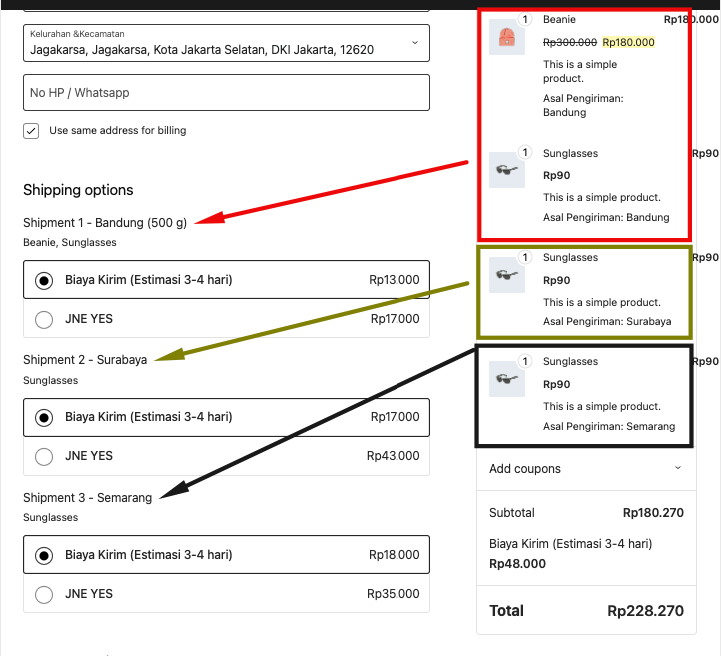 Untuk halaman Checkout nantinya. Jika pembeli memilih produk dari kota asal bebeda. maka pengiriman akan dibagi menjadi tiap kota yang di pilih.. jadi lebih fleksible juga.