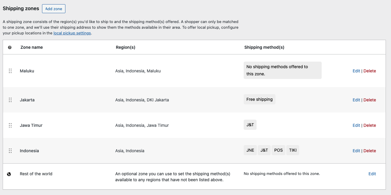 Shipping Zone sendiri adalah wilayah pengiriman yang kita tentukan untuk mengatur ongkos kirim berdasarkan lokasi customer. Singkatnya, WooCommerce hanya akan menampilkan metode & tarif pengiriman tertentu kepada pembeli sesuai zona yang mereka berada.