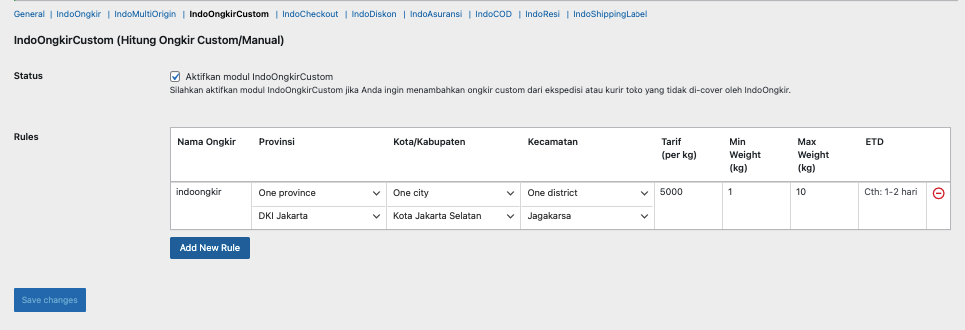 Untuk mengakses menu ini kita bisa ke Woocommerce – IndoOongkir – IndoOngkirCustom