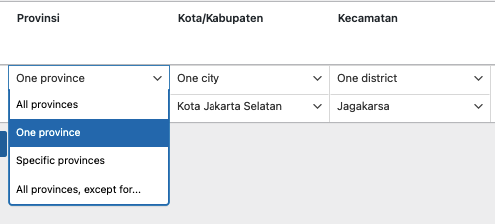 Untuk Provinsi/Kota/Kecamatan bisa di atur untuk  Keseluruhan, Satu saja, Spesifik ke beberapa provinsi/kota/kecamatan saja, atau Keseluruhan kecuali daerah tertetu.