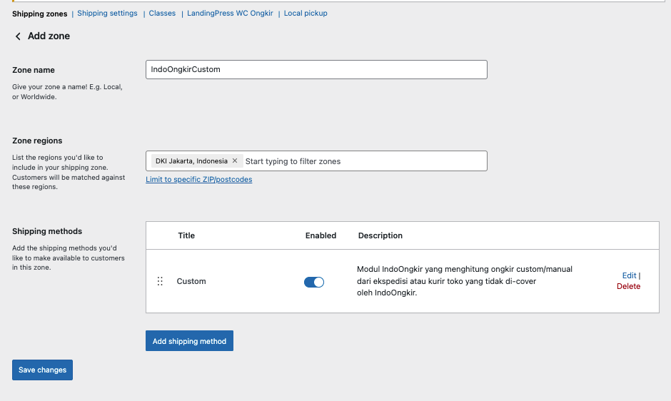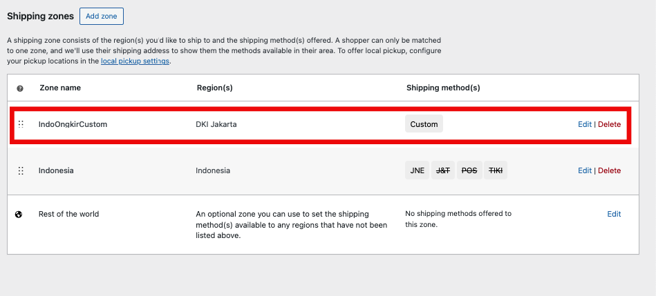 Selanjutnya kita aktifkan Custom Ongkir yang kita buat dengan membuat Shipping Zone Baru dengan shipping methode kita atur IndoOngkir-Custom