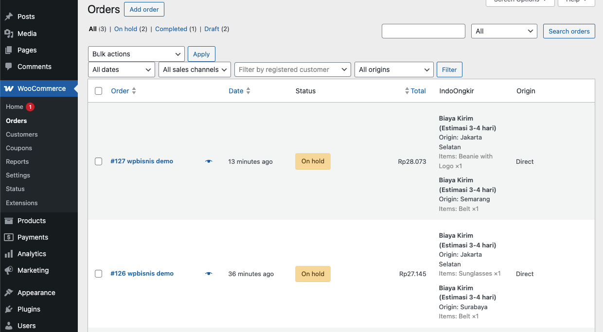 Ketika Pembeli sudah menyelesaikan proses checkout. maka laporannya bisa kita akses di menu Dashboard — Woocommerce — Orders. Seluruh daftar traksaksi terdata disana.. kita pilih #127 wpbisnis demo sebagai contoh.