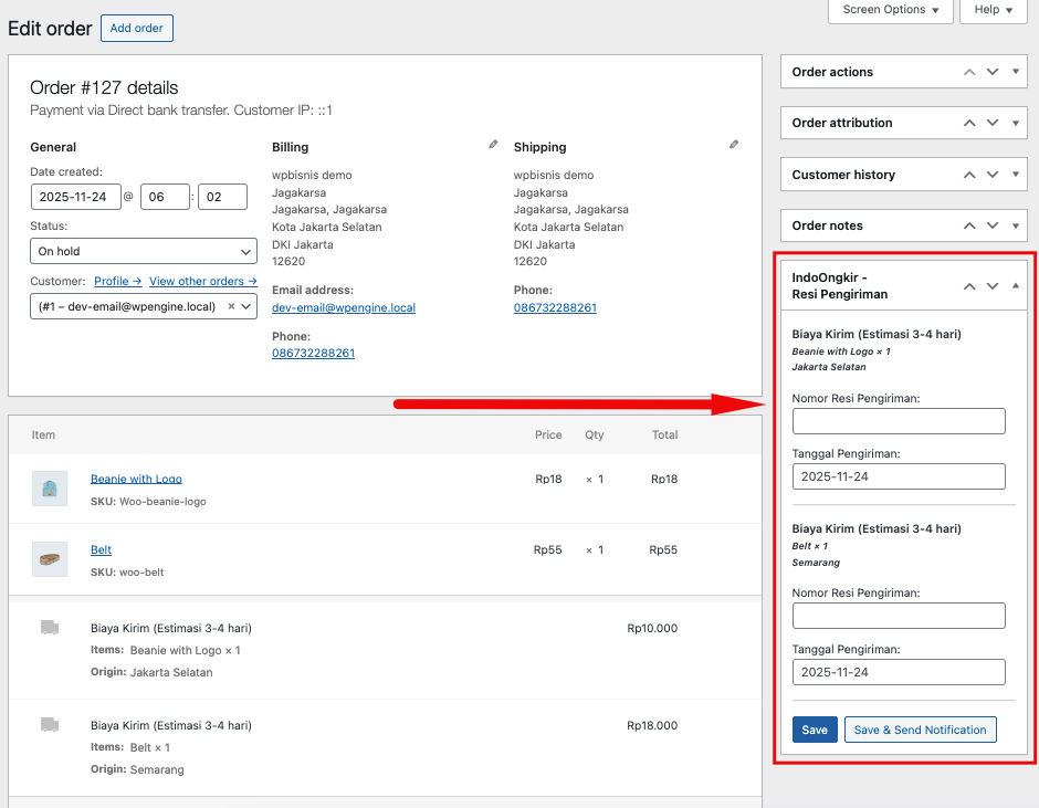 Selanjutnya bisa kita lihat karena pesanan yang kita buat tadi adalah multi origin dikirim dari 2 kota berbeda. maka di laman kotak IndoOngkir Resi tersedia dua field untuk mengisi Resi. untuk dari Jakarta Selatan dan dari Semarang. Silahkan di isi resinya di tempat tersebut