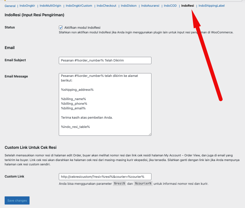 Pertama pasti kita aktifkan menu IndoResi dahulu di pengaturan IndoOngkir ya. Di Pengaturan utama, kita bisa membuat template untuk email ke pembeli ketika pesanan sudah dikirim.. jadi ketika kita sudah isi resi pembeli langsung dapat notifikasi via email.