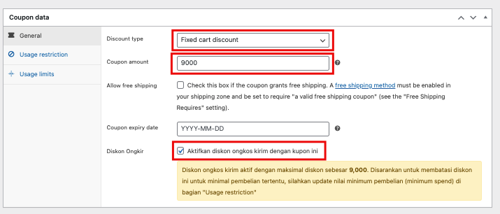 pilih Fixed Cart Discount, dan set coupon amount untuk maksimal subsidi ongkir yang diberikan