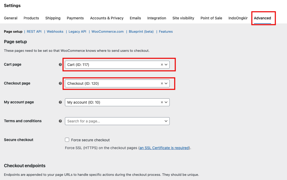 Kita bisa ke menu Woocomerce – Setting – Advance. Lalu atur cart page dan checkout page dengan page yang sudah kita buat tadi.